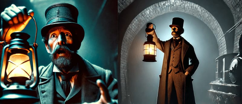 [Left] Prompt: A picture of the signalman from Charles Dicken's story, Signalman. He is shown holding his lantern aloft, warning the viewer to stay back. He has a fearful and frantic look on him. The lantern casts the only light, and most of it falls upon the signalman. Shallow depth of field. Color. Photorealism. Canon EOS 5D