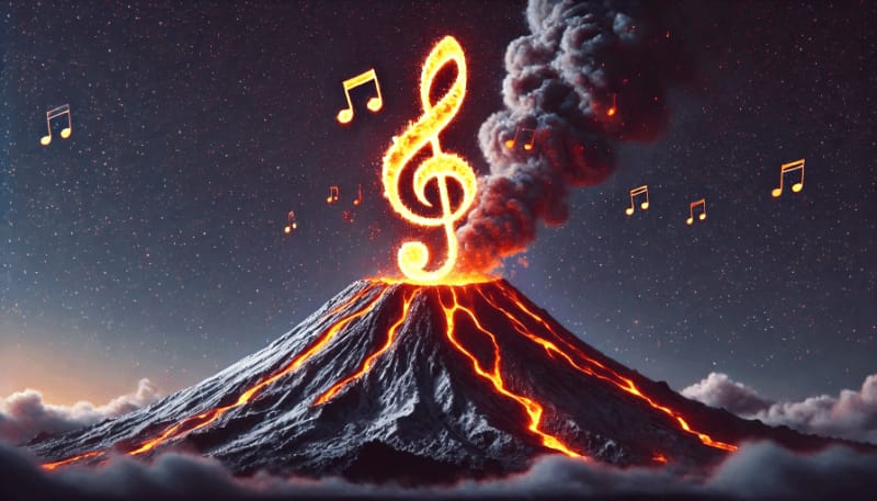 Image Creation Prompt: Create an image of a volcano. It is set against a dark sky. Molten magma is spewing out of the top. The largest blobs of magma form the shape of musical notes. Photorealism. HDR. Wide aspect ratio.